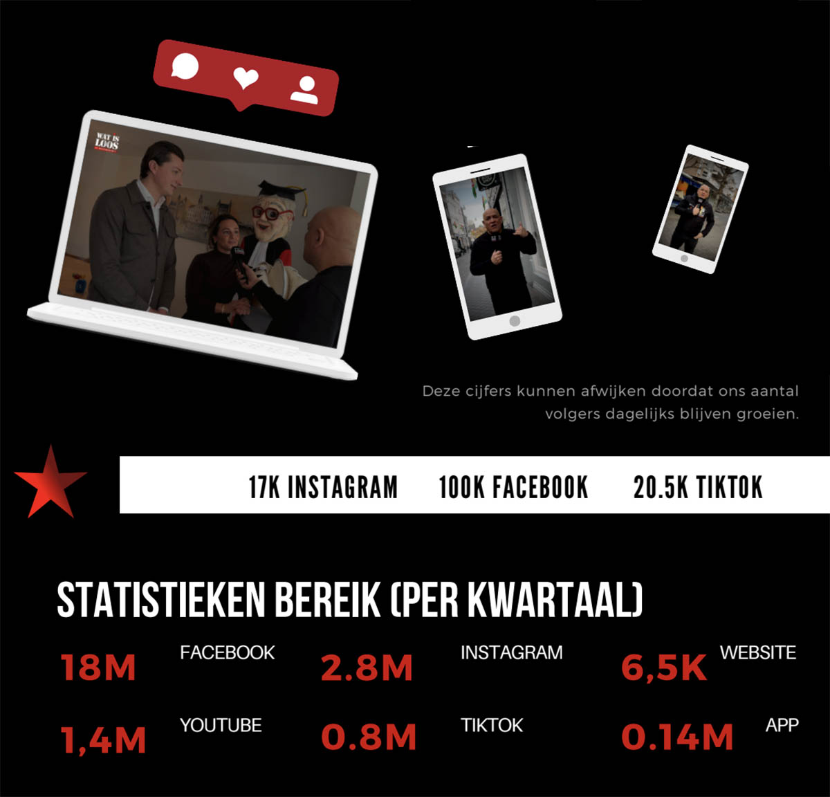 Zo kun je al zichtbaar zijn met een Instagram post of TikTok video, maar ook kiezen voor grotere impact met bijvoorbeeld een ‘Bedrijf in Beeld’ reportage, app advertenties of een langdurige ALL-IN samenwerking. Elk middel heeft zijn eigen kracht en bereik, waarbij we samen kijken wat het meeste oplevert voor jouw bedrijf.